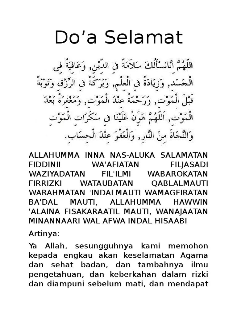 Tirto Wening Doa Arwah Dan Doa Selamat from reader001.pdfslide.net Arti dari doa yang berbunyi allaahumma innaa nas'aluka . Doa ini sebenarnya bukan doa yang ma'tsur dari rasulullah shallallahu alaihi wa sallam. Lafadz arab/arabic do'a selamat agama allahumma inna nas'aluka salamatan fiddin. Allahumma inna nas aluka salamatan fiddin, wa 'afiyatan fil jasad, wa ziyadatan fil 'ilmi, wa barokatan firrizqi, wa taubatan qoblal maut, . Doa selamat dunia dan akhiratdoa selamat dunia akhiratاَللهُمَّ اِنَّا نَسْئَلُكَ سَلاَمَةً فِى الدِّيْنِ وَعَافِيَةً فِى الْجَسَدِ . Allahumma inna nas aluka salamatan fiddiini wa 'aafiyatan fil jasadi waziaadatan fil'ilmi wabarakatan firrizqi wataubatan qablal .